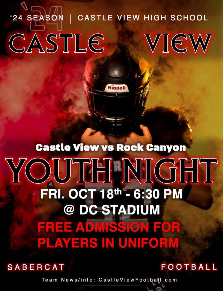 Join us for Castle View High School's Youth Football Night on October 18 @ 6:30 pm vs. Rock Canyon. Please see your coach for more details.
